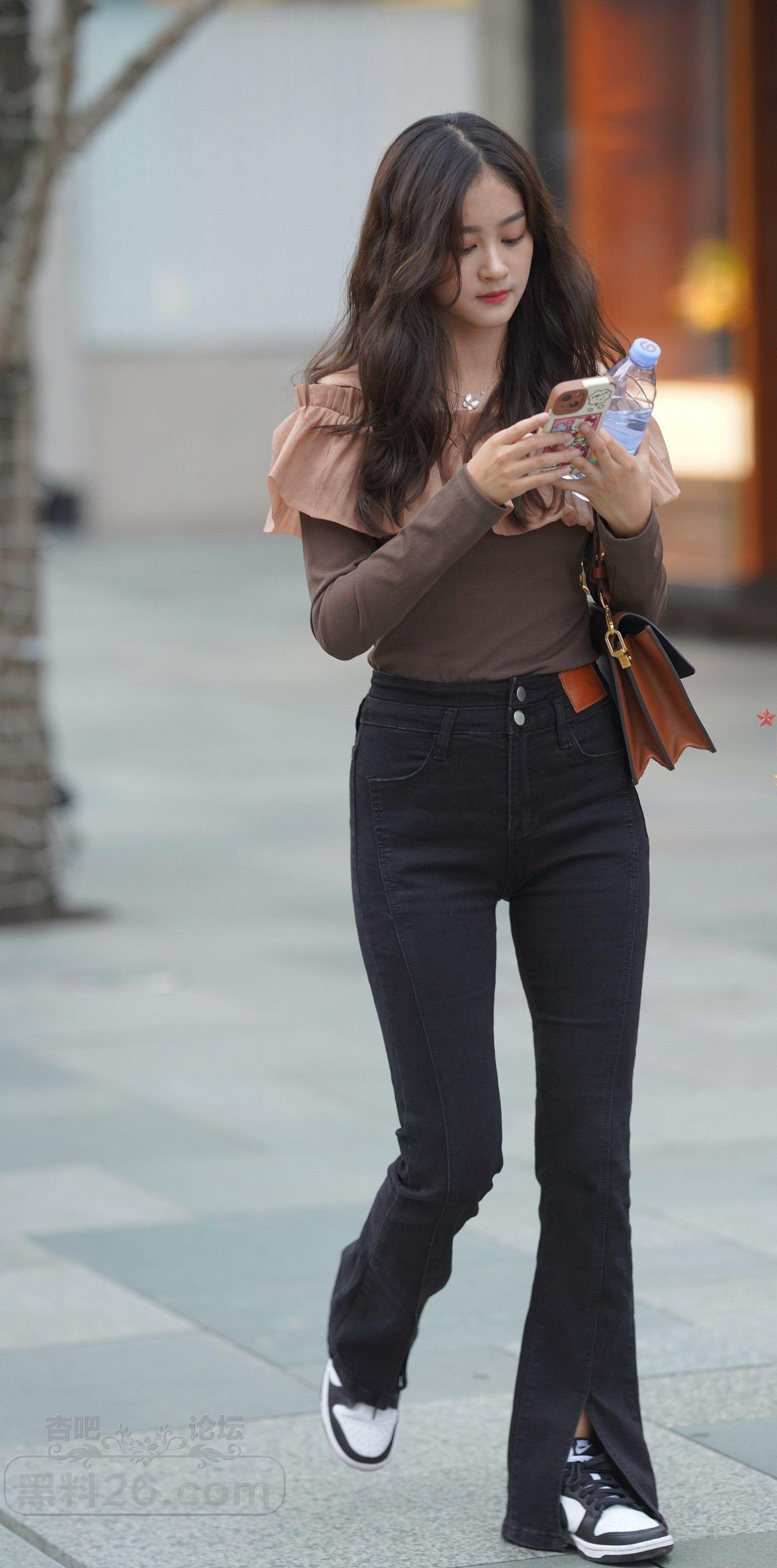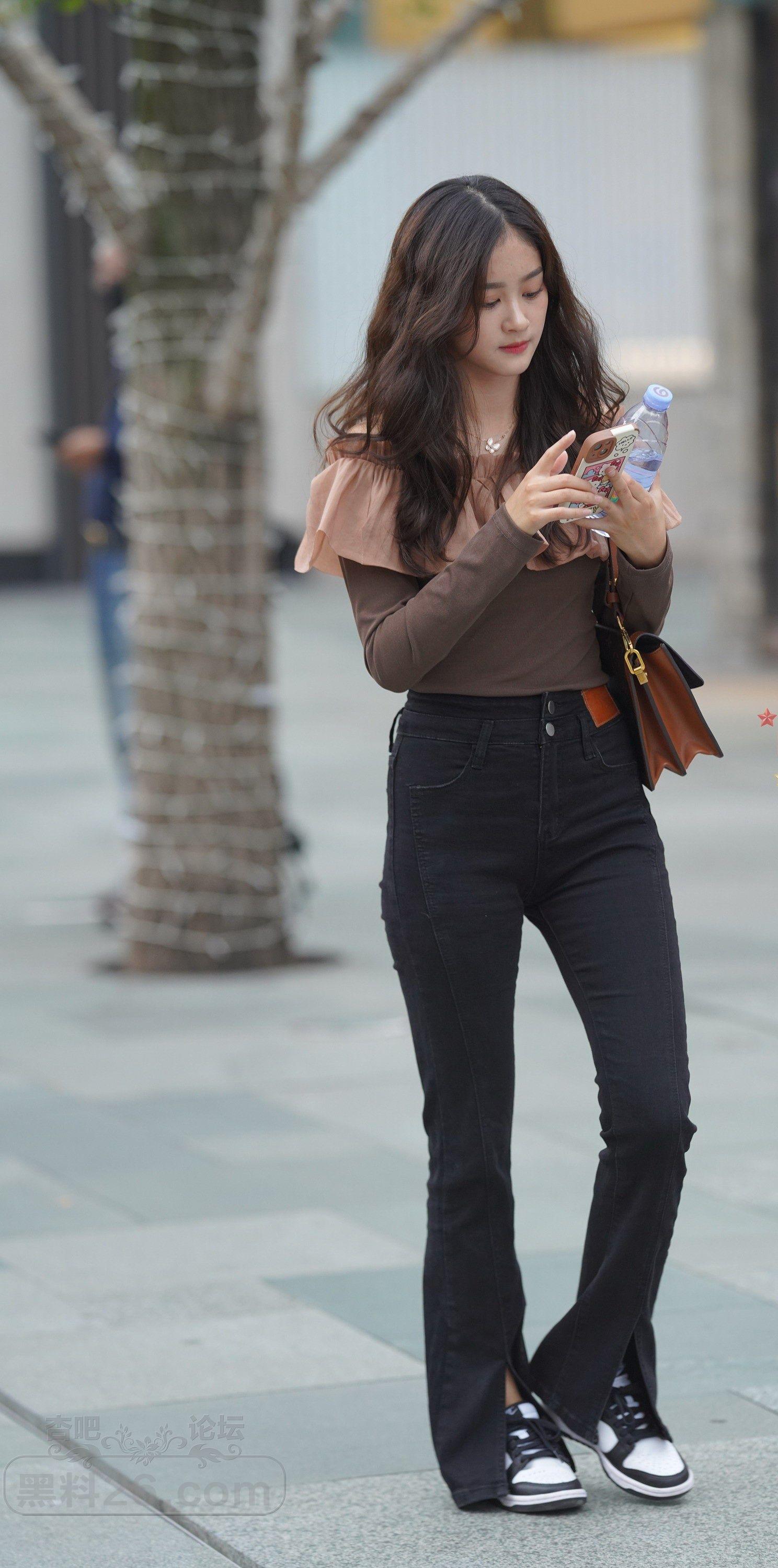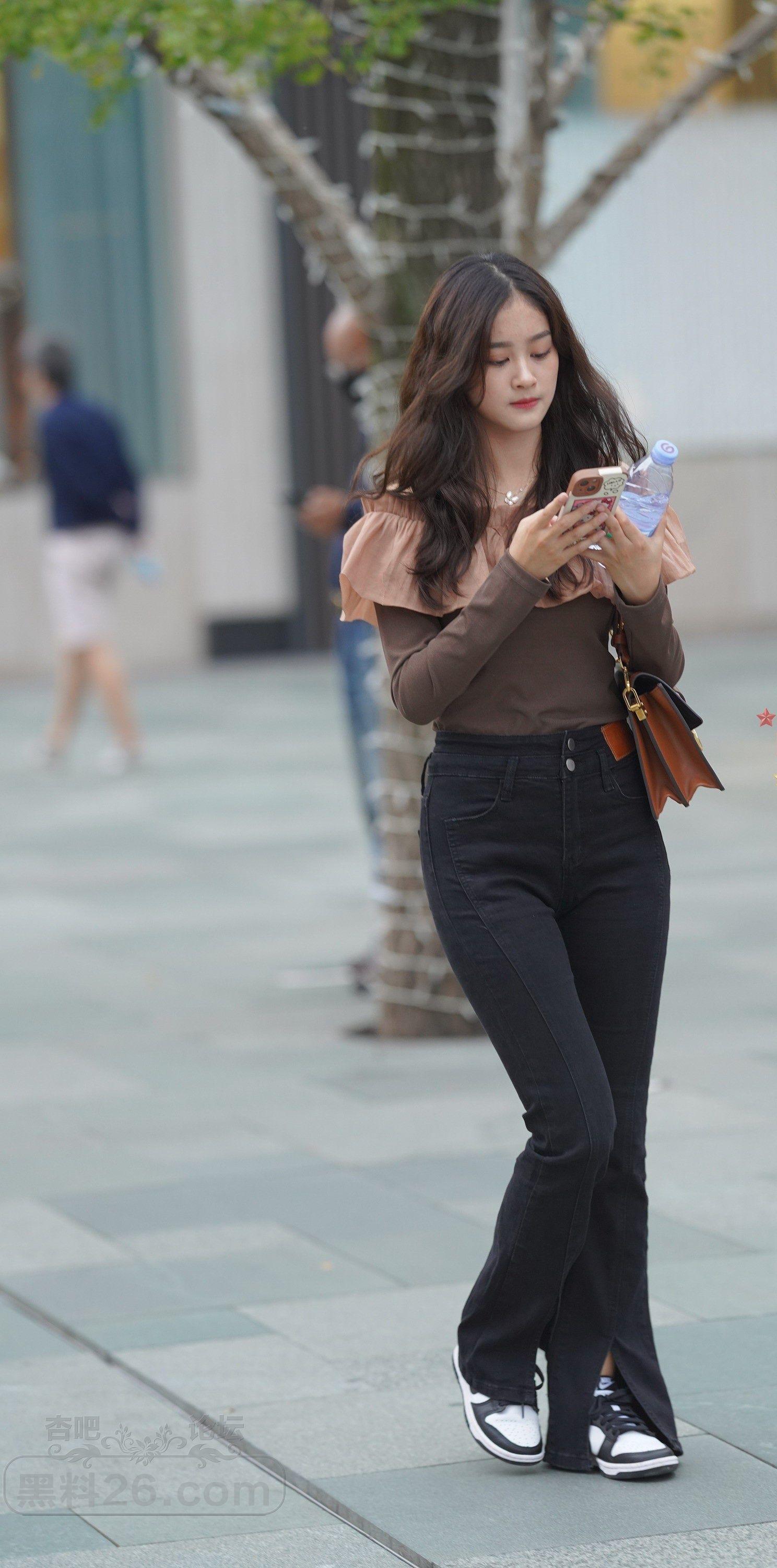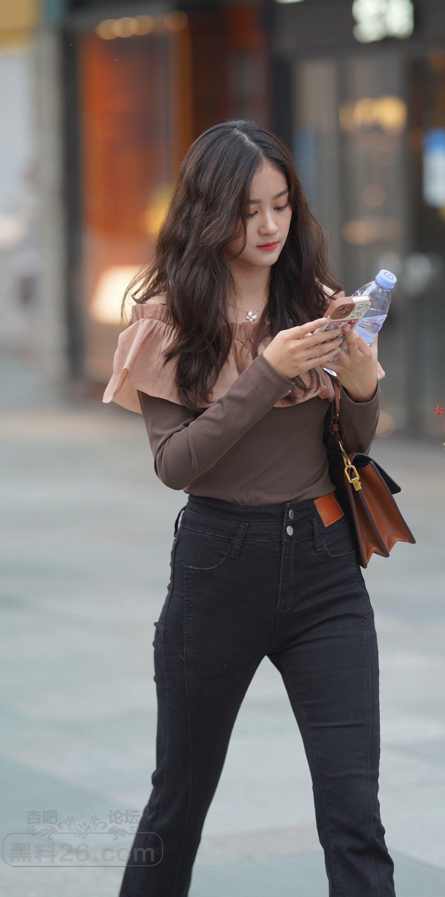 棕色长袖衣黑色紧身裤长发美女边走边玩【10P】
